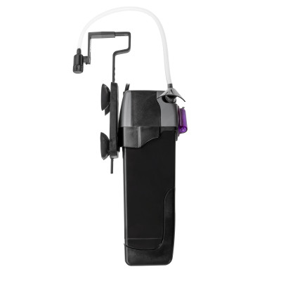 Filtr Unifilter UV-C można zamontować na szybie akwarium krótszym lub dłuższym bokiem. Dzięki takiemu rozwiązaniu filtr daje się ukryć w mniej widocznej części akwarium, np. za roślinnością. Przyssawki i regulowany wieszak zapewniają stabilność urządzenia.
