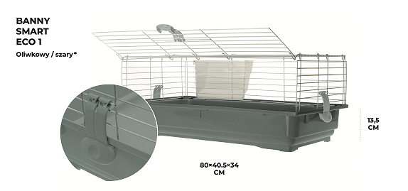 Banny Smart Eco to klatka dla młodych królików, małych królików i średnich gryzoni. Jej plastikowe elementy są wykonane z materiałów pochodzących w 96% z recyklingu. Banny Smart Eco posiada duże otwarcie z góry oraz unoszoną ścianę, co daje komfort zarówno gryzoniowi, jak i jego opiekunowi. Wygodna do przechowywania i transportu – można ją złożyć do wysokości kuwety. Dostępna w 4 wariantach i 3 rozmiarach, zależnie od rodzaju z kuwetą oliwkową / szarą lub czarną. Zaprojektowana i wyprodukowana w Polsce.
