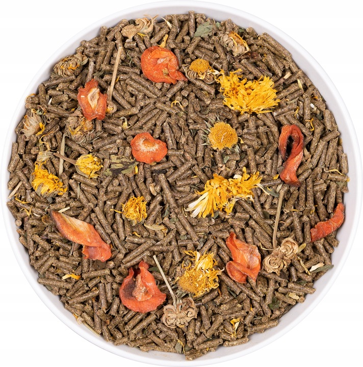 Wysoka zawartość siana (34%) – Ponad 45 gatunków traw i ziół, wspomagających trawienie i ścieranie zębów.