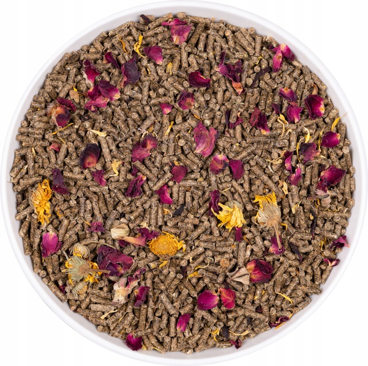 Siano (42%), (tymotka, kostrzewa, rajgras, lucerna i suszone na słońcu siano górskie to tylko niektóre z ponad 45 gatunków tworzących to siano), otręby (26,40%), płatki grochu wzbogacone witaminą C, strąki chleba świętojańskiego, całe ziarna soi, marchew (3,50%), całe nasiona słonecznika, bób, pulpa buraczana (2%), cykoria, echinacea, nagietek, siemię lniane, węglan wapnia, płatki róż, sól, drożdże piwne, oregano, tymianek, cynamon i kurkuma.