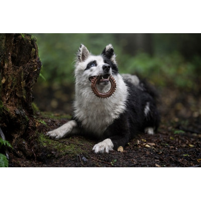 Dental Ring to elastyczna i zapachowa zabawka z dodatkiem drewna z recyklingu. Posiada otwory na smakołyki, dzięki czemu nie tylko zapewni psu świetną rozrywkę, ale może też stać się narzędziem wspierającym jego rozwój.