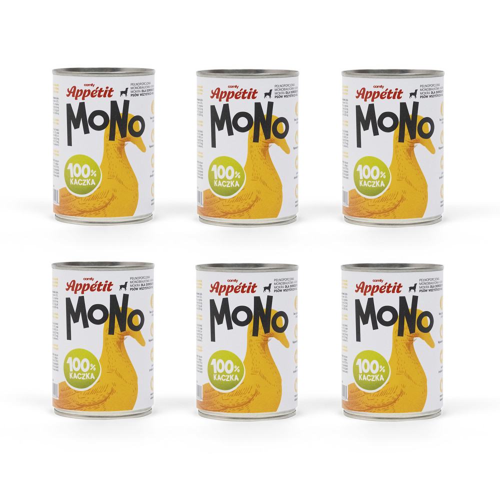 Comfy Appetit MONO to pełnoporcjowa, jednobiałkowa mokra karma dla psów dorosłych, stworzona na bazie naturalnych składników. Produkt zawiera 96% mięsa i składników pochodzenia zwierzęcego. Jest dostępny w kilku wariantach smakowych: