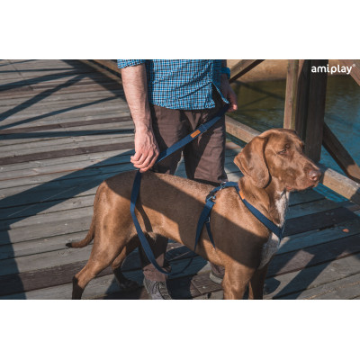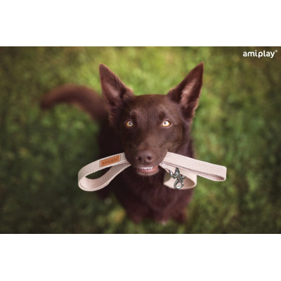 Smycz wykonana jest z bardzo wytrzymałej, a jednocześnie elastycznej ekologicznej taśmy bawełnianej produkowanej specjalnie dla firmy amiplay. Jest miękka i przyjemna w dotyku, dzięki czemu bardzo dobrze leży w dłoni, nie powodując otarć. Jest idealnej długości na miejskie spacery dla zapewniania psu bezpieczeństwa, a nam wygody. Mocny karabińczyk umożliwia swobodne przypięcie oraz odpięcie smyczy, a dzięki wytrzymałości zapewnia bezpieczeństwo podczas mocniejszego szarpnięcia w czasie spaceru. Przy uchwycie znajduje się oczko służące do wygodnego przypięcia pojemnika na woreczki. Dodatkowo smycz jest wzmocniona przy karabińczyku i uchwycie co sprawia, że jest bardziej wytrzymała na uszkodzenia.