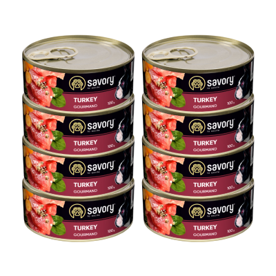 • SAVORY KARMA MOKRA Z INDYKIEM DLA WYBREDNYCH PSÓW WSZYSTKICH RAS 8x100 G